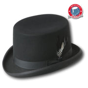 A Timeless Classic! This top hat features a 5" tall squared crown and structured brim. Finished with a grosgrain band and bound edge. Topped off with a removable feather*.