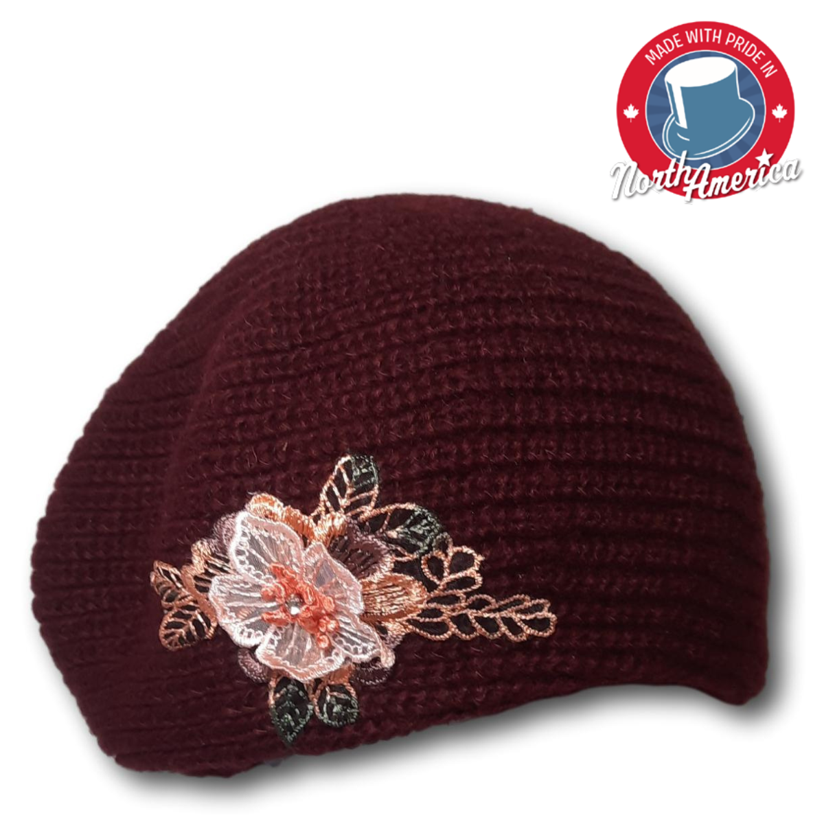A classic style with an elegant touch. This knit beret features a floral applique for detail. Dress this piece with your favourite Winter jacket.