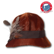Beautiful, unique, Handmade by Pandemonium Millinery in Seattle, WA. This velvet cloche takes you back to the 1920's with it's vintage inspired look. Finished with a grosgrain band, and removable feather fan broach for added flare.