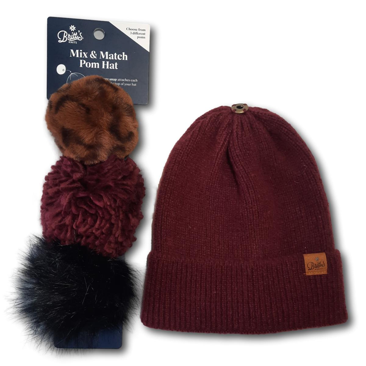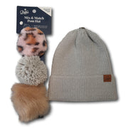 A toque for everyday wear! This piece features three different pom poms fixed by snaps! Change the pom pom to match your outfit!