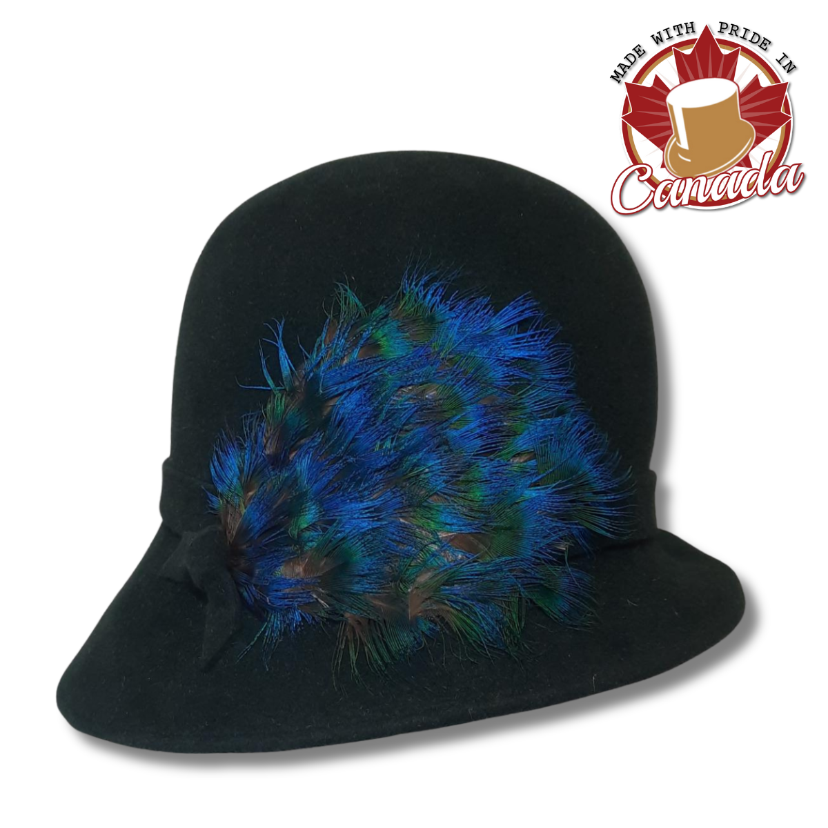 This hand made piece is crafted in Toronto by Lilliput Hats. Featuring a classic round crown and a dramatic feather detail. This is the perfect piece for any hat lover.