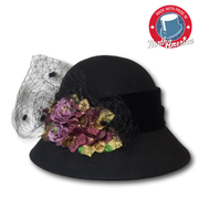 A timeless style. This cloche features a turned down brim and a round crown. Finished with a velvet band, netting and flowers for drama.