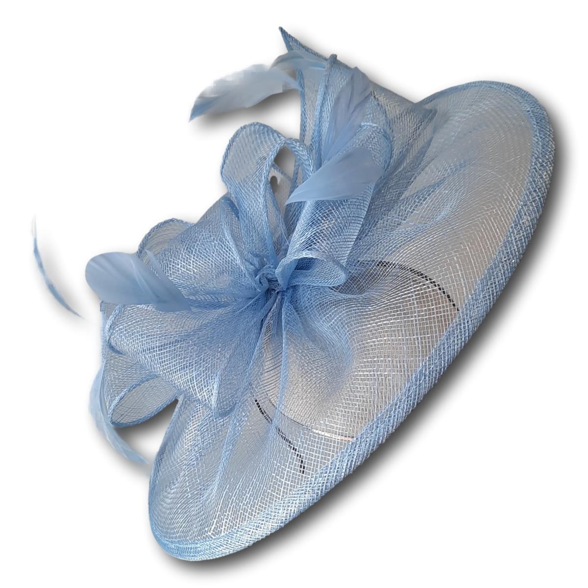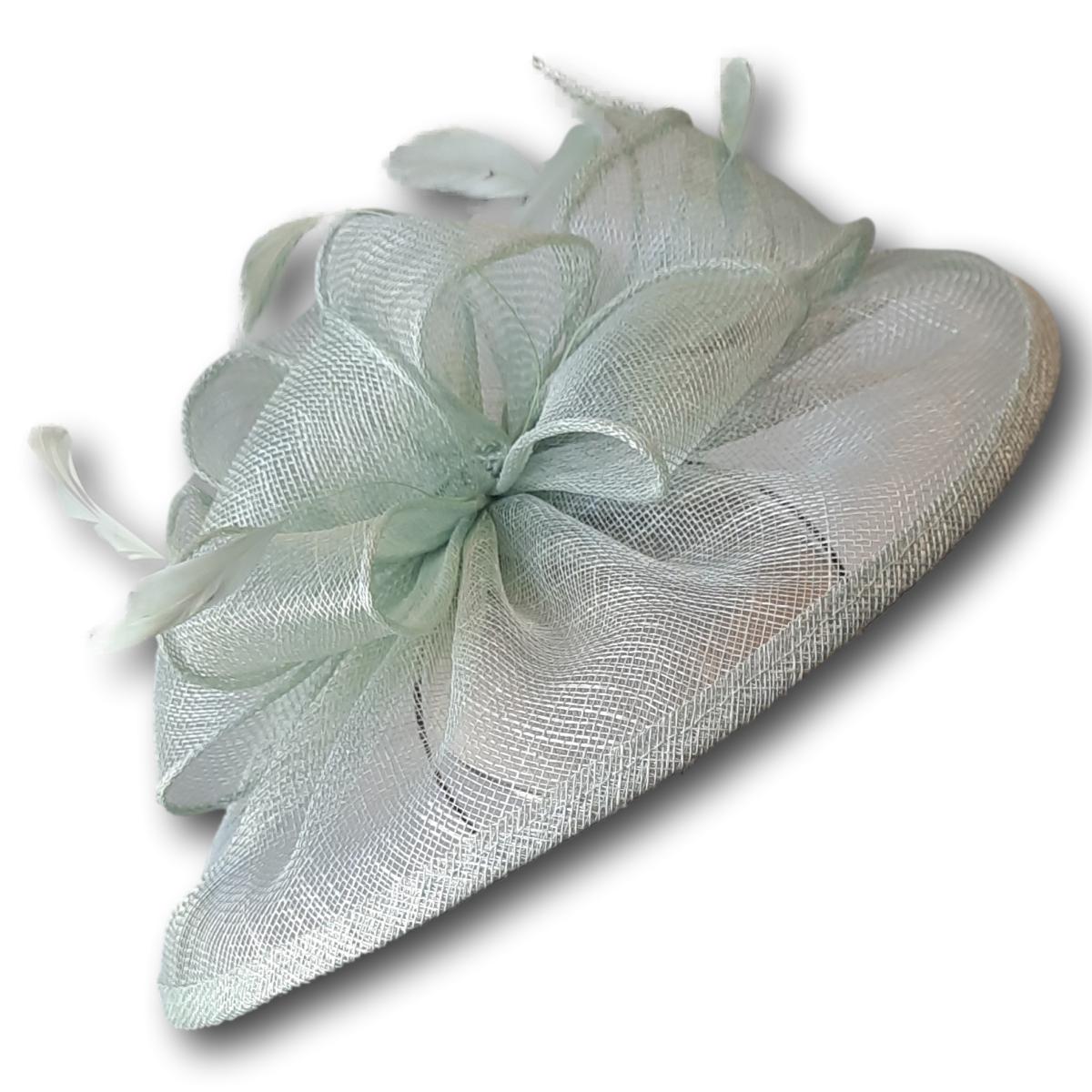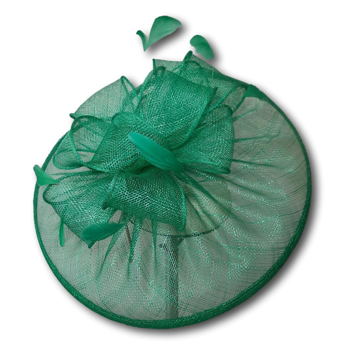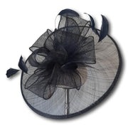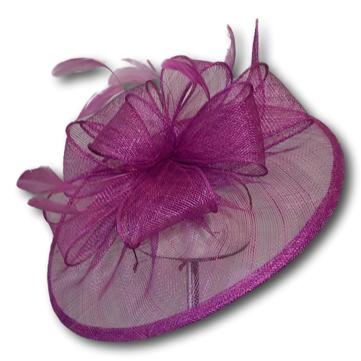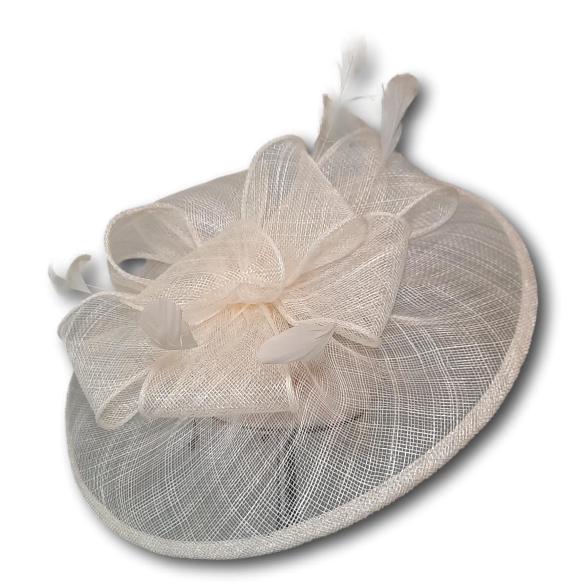 Fun and flirty, this sinamay fascinator features a rounded saucer base with looped bows and dainty feather wisps. Secured to a headband for an easier fit.